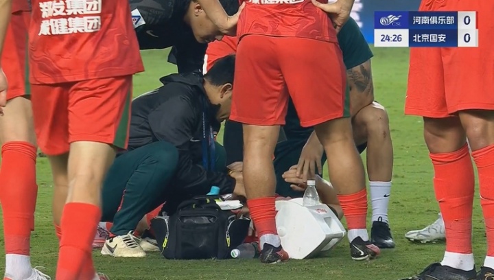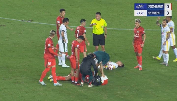 比赛第24分钟,林良铭和阿卜杜肉苏力中场拼抢高球时头部相撞,双双倒地。