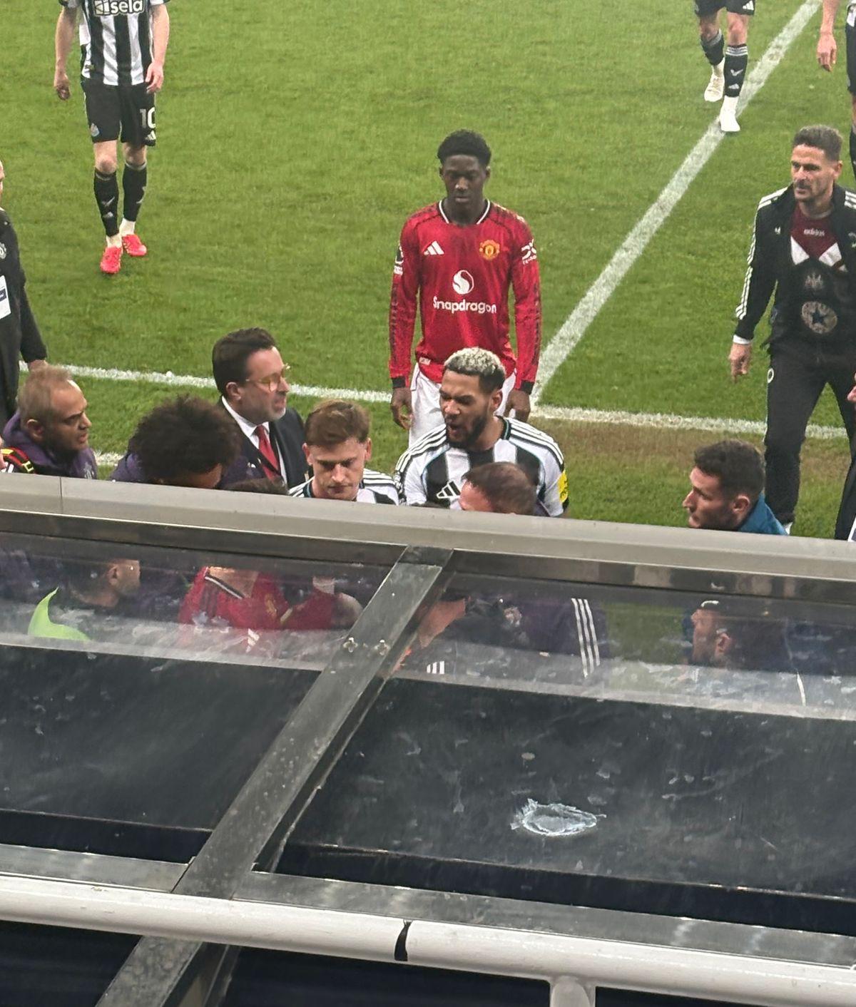 B费与乔林顿互呛,两人被强行隔开。B费用手指着这位纽卡斯尔联的强硬中场,或许是在提醒他能留在场上已是侥幸。