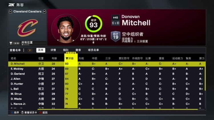 多诺万·米切尔以93分领跑全队,埃文·莫布里89分位列次席,达里厄斯·加兰87分与贾勒特·阿伦84分分列三四位,德安德烈·亨特80分排名第五。
