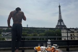 戈登晒出自己在巴黎的照片,他赤裸上身遥望埃菲尔铁塔,身旁摆放着丰盛的餐食。