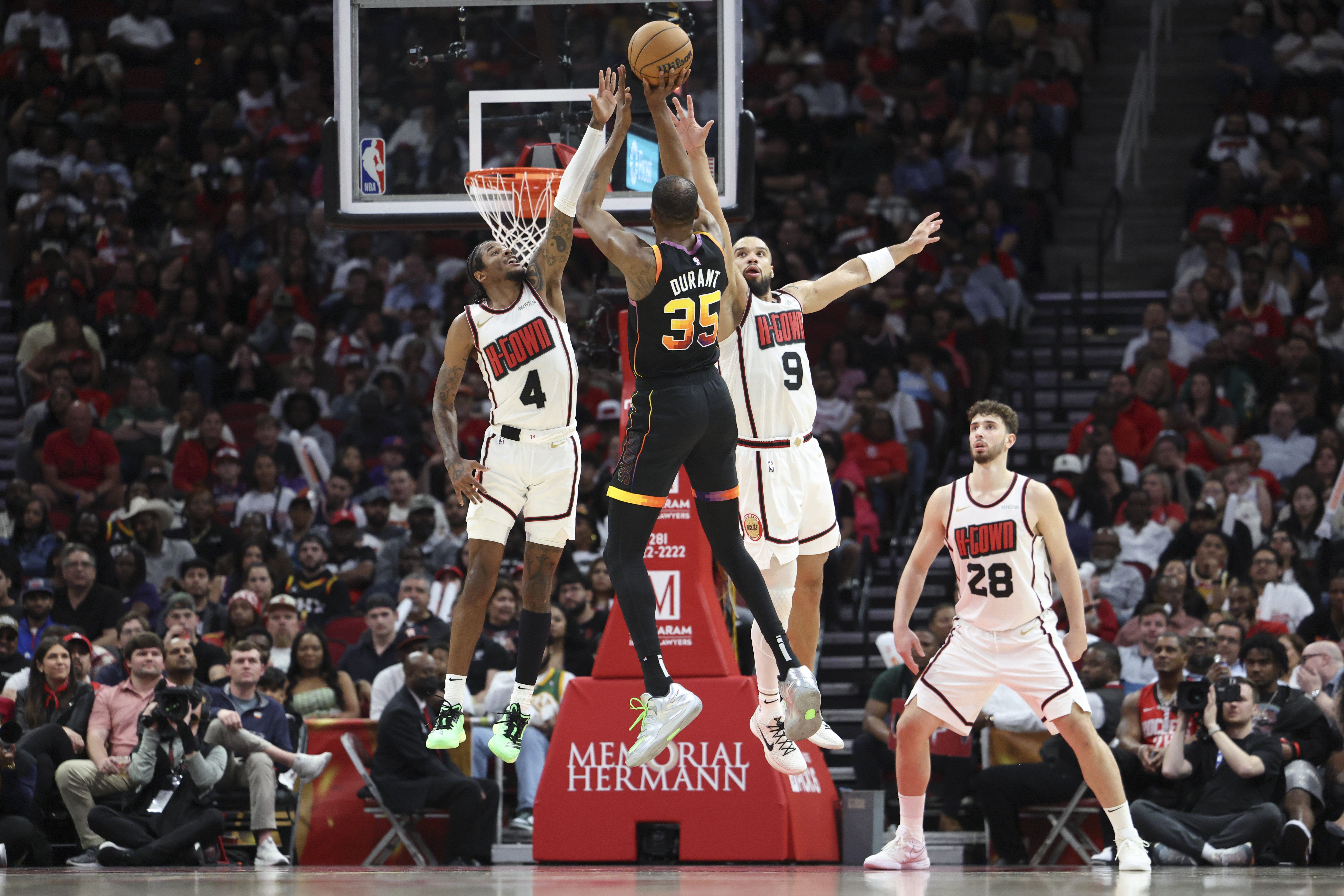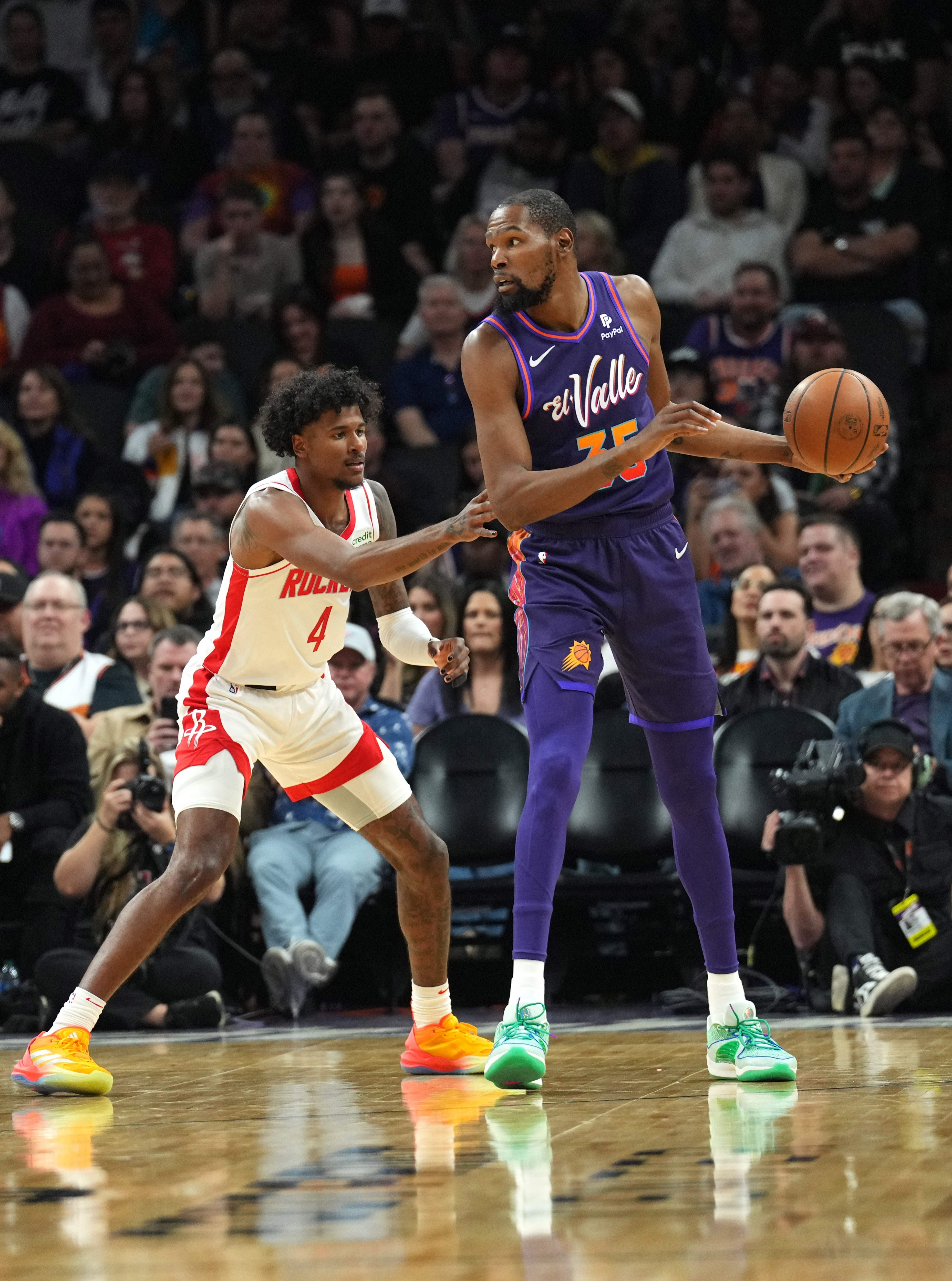 让我们先从杜兰特说起。尽管太阳队上赛季经历了种种混乱,但他们仍然是半场进攻排名前十的球队,这简直是个奇迹,而这要归功于杜兰特和他即便在36岁时依然保持的稳定性。根据Cleaning the Glass的数据,当杜兰特在场时,太阳队的进攻效率要高出对手6.2分,这一影响力超过了联盟90%的球员。杜兰特所在球队的有效命中率会提升近6个百分点,这在他之前效力的每一支球队都有着同样的趋势。在身边有了更加出色的球员之后,杜兰特应该会使得火箭队的数据飙升。从纸面上看,一位全能的得分手与活力十足的悍将、高球商的低位球员进行搭档,这是一个无缝的配合。