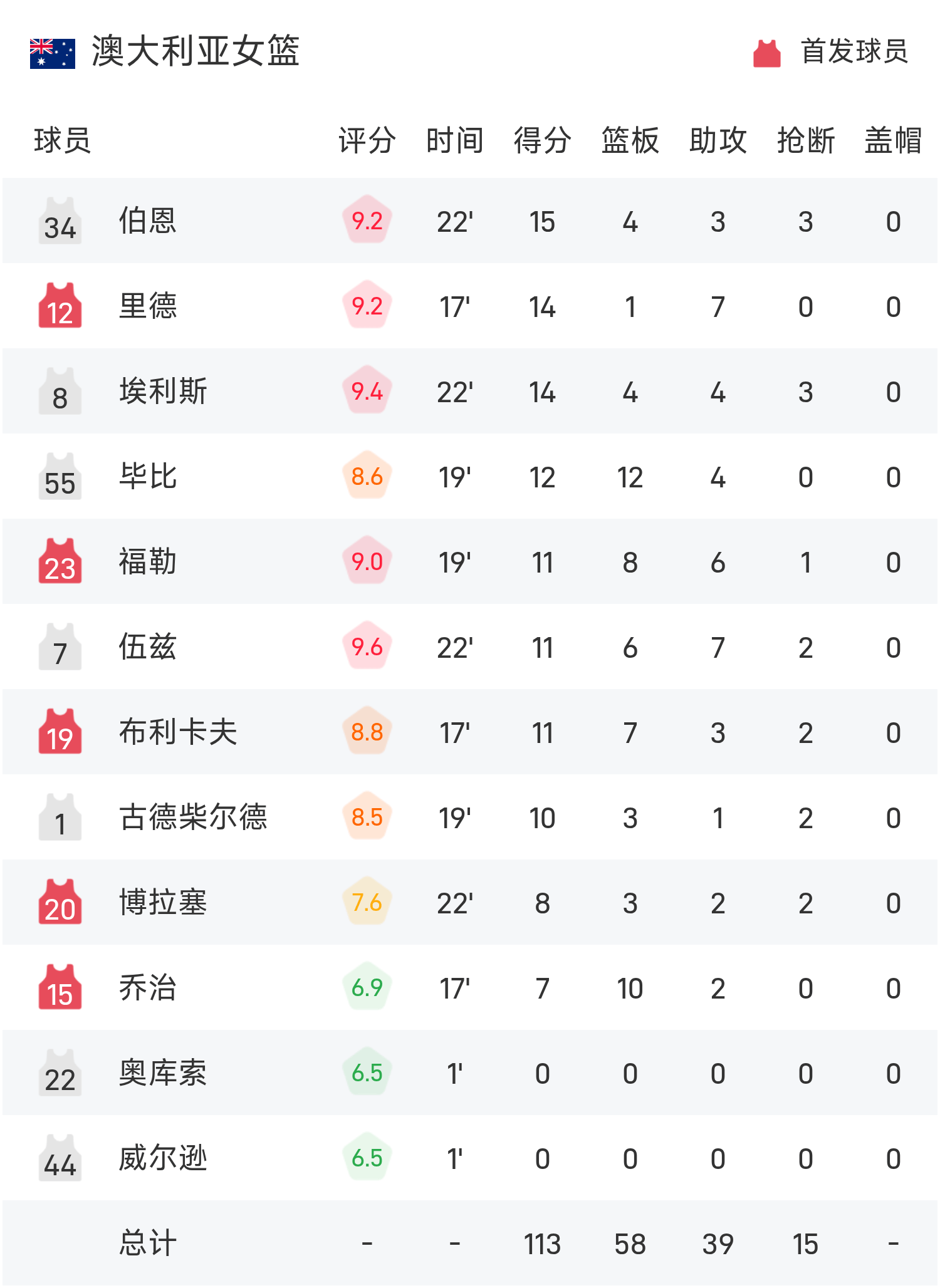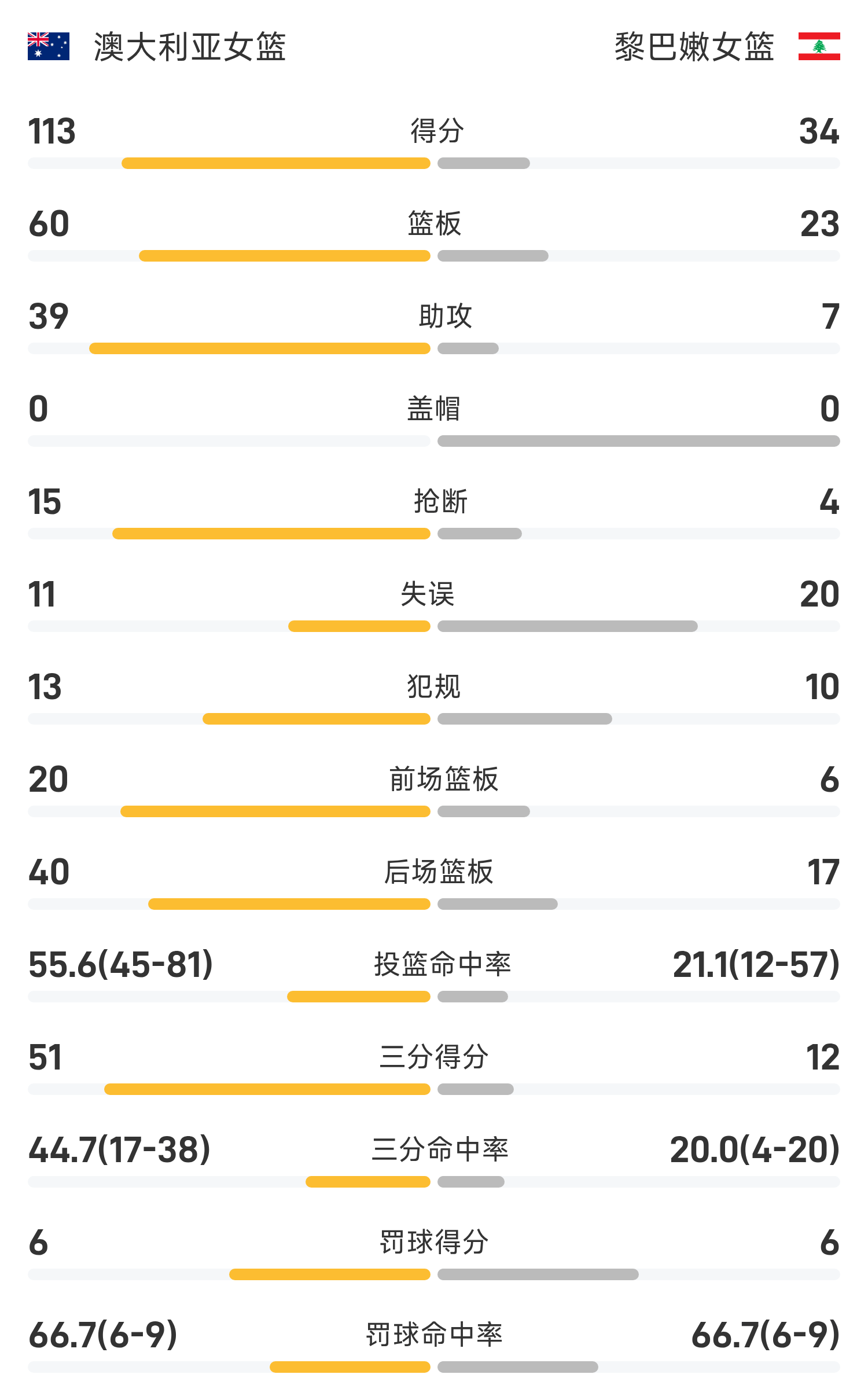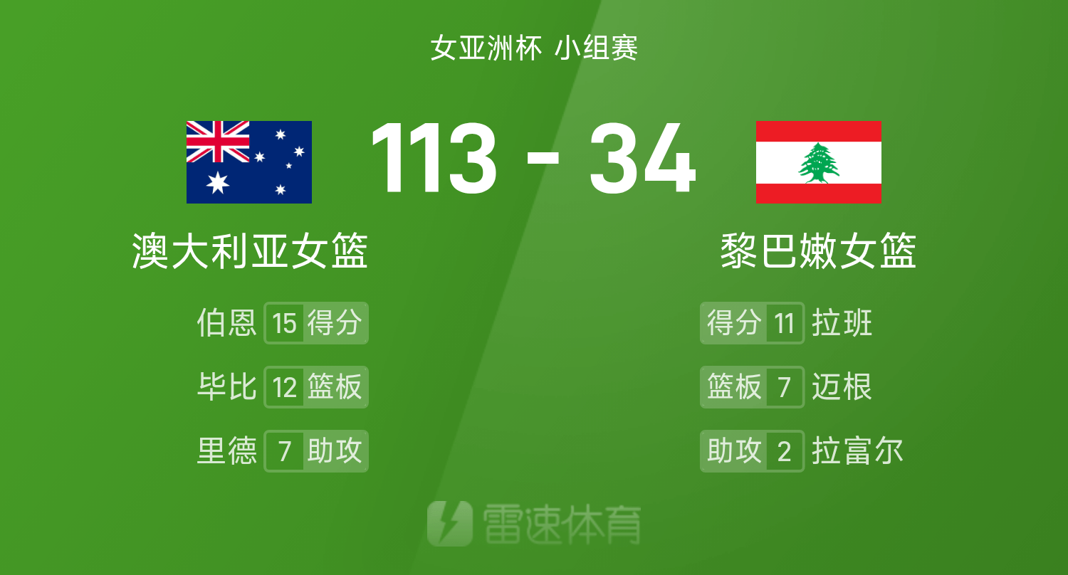 07月14日讯 25赛季女亚洲杯 小组赛,黎巴嫩女篮对阵澳大利亚女篮。双方全场战罢,黎巴嫩女篮34-113不敌澳大利亚女篮。伯恩砍下全场最高的15分4板3助,率领澳大利亚女篮成功取胜。